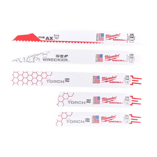 1 x AX ™ hout met spijkers - 230 mm x 5 Tpi (48005026), 1 x WRECKER ™ multi-materiaal - 230 mm x 8 Tpi (48005706), 1 x TORCH ™ metaal - 230 mm x 14 TPi (48005787), 1 x TORCH ™ metaal - 150 mm x 14 TPi (48005782), 1 x TORCH ™ metaal - 150 mm x 18 TPi (48005784)